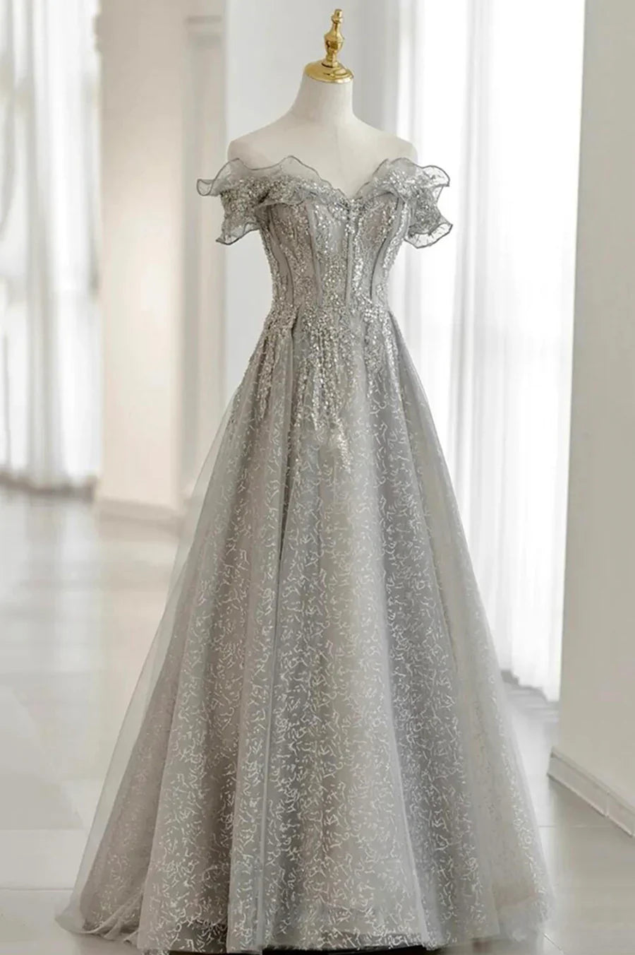 Grey Tulle Sequins Long A-Line Prom Dresses, Off the Shoulder Evening Dresses HZ1024