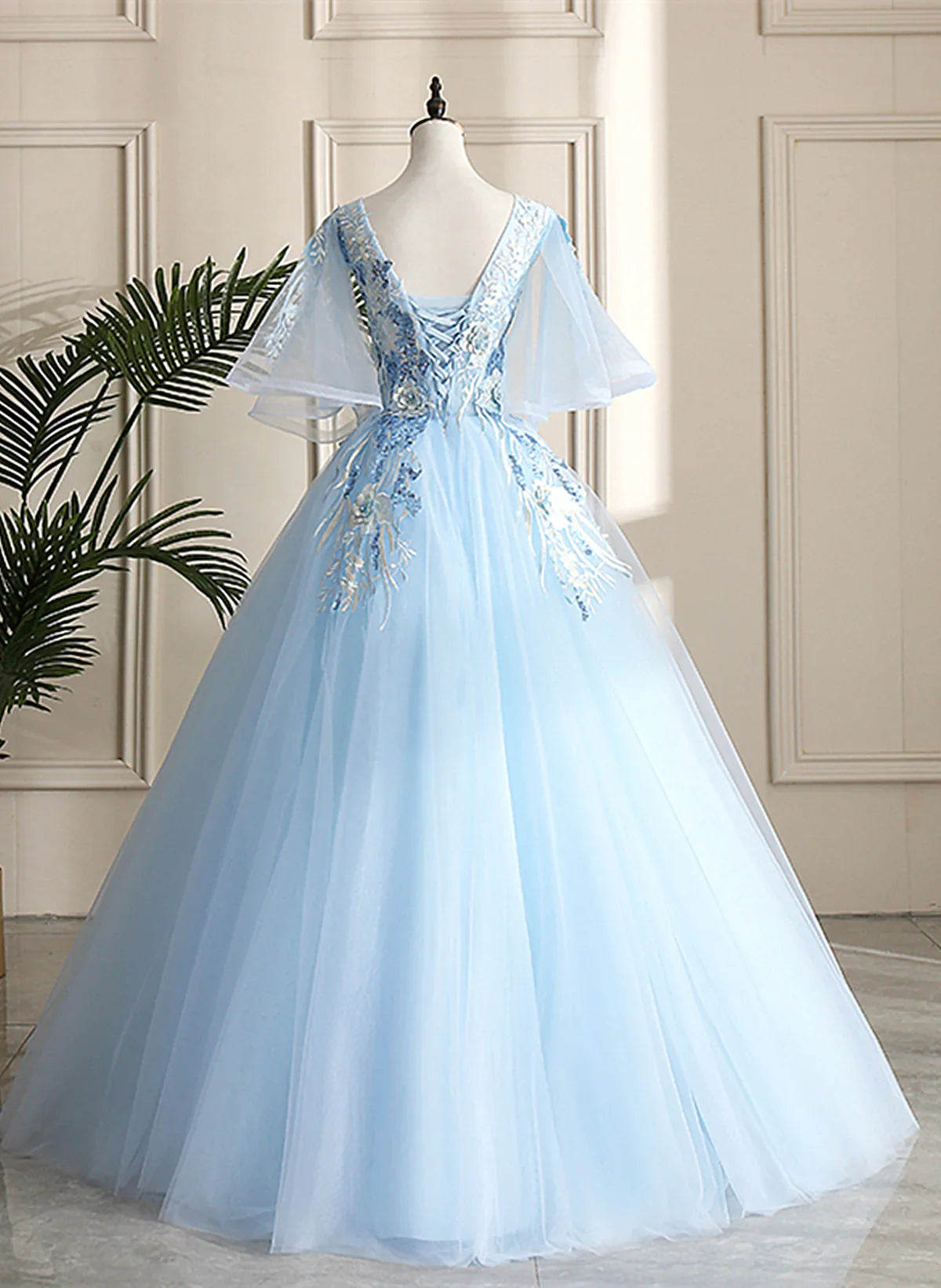 Light Blue Ball Gown V-neckline Puffy Sleeves Party Dress, Light Blue Sweetheart 16 Dress HZ1024