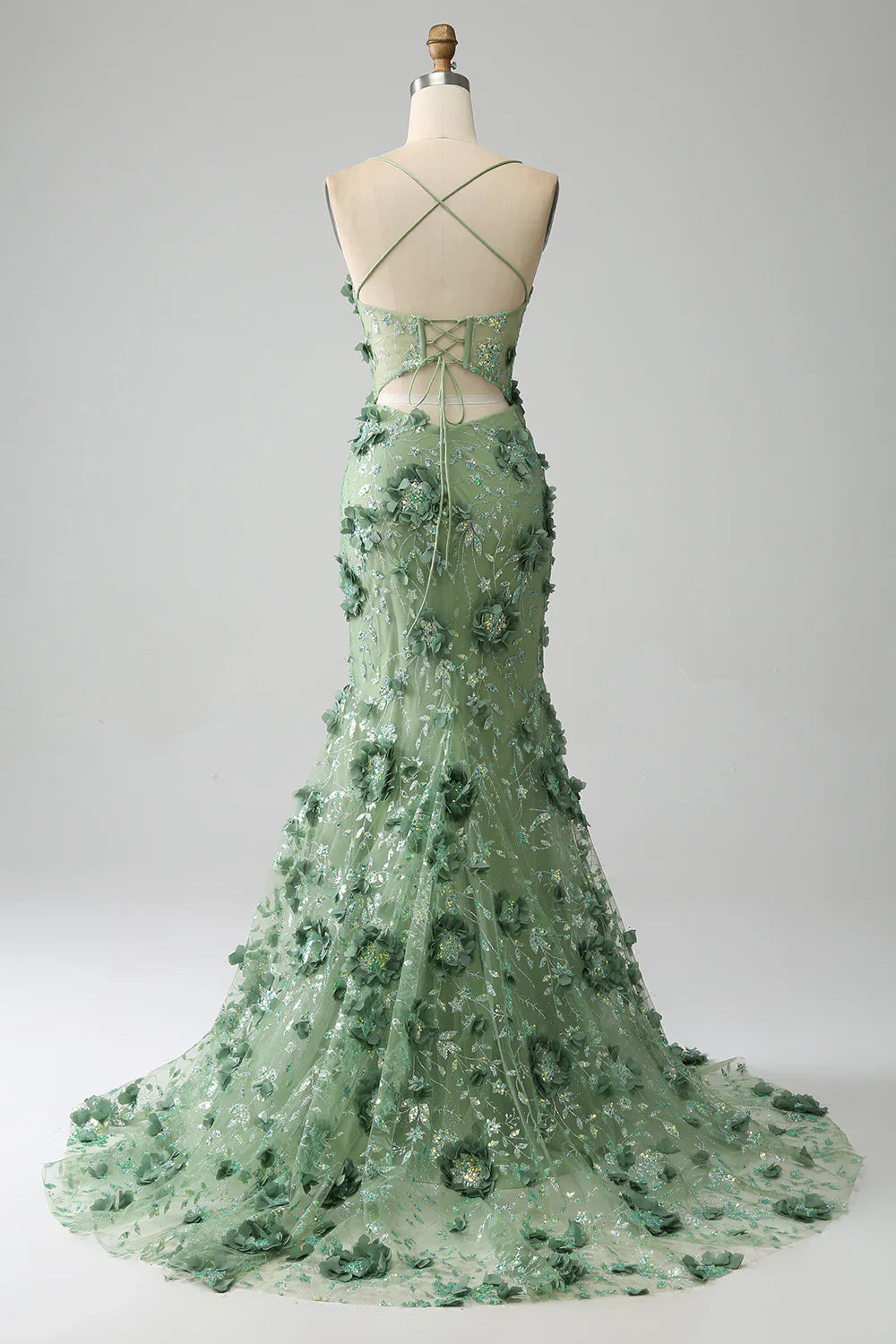 Mermaid Spaghetti Straps Green Corset Prom Dress with Appliques HZ1024