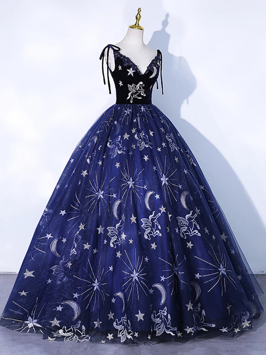 Navy Blue Tulle Long Prom Dress, Spaghetti Straps Lace Flower Backless Evening Dress HZ1024