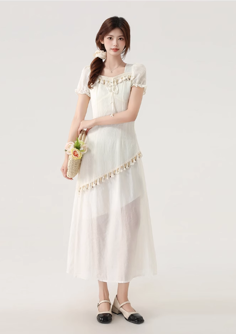 New Fashion Apricot Irregular Fringed Dress Hem Design A-line Square Collar Short-sleeved Dress HZ1024