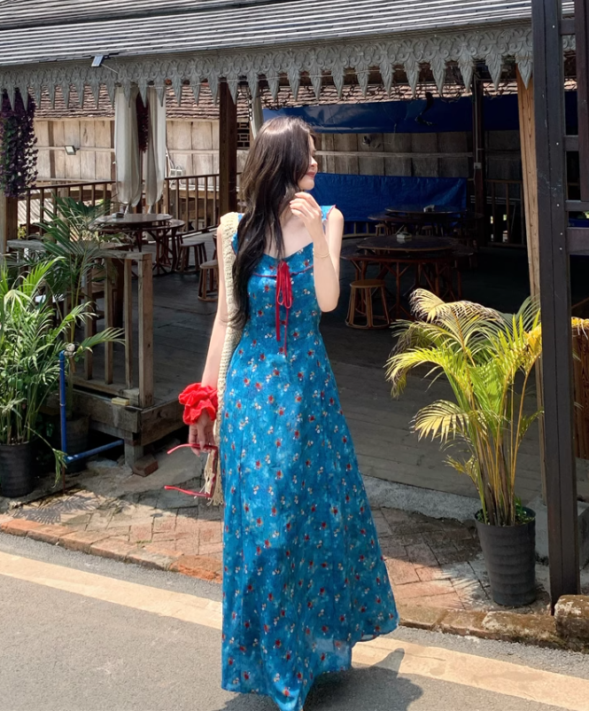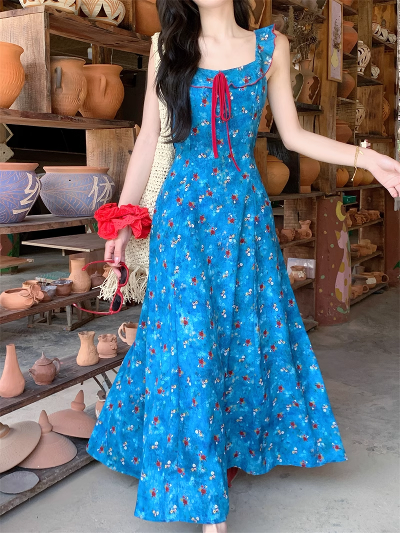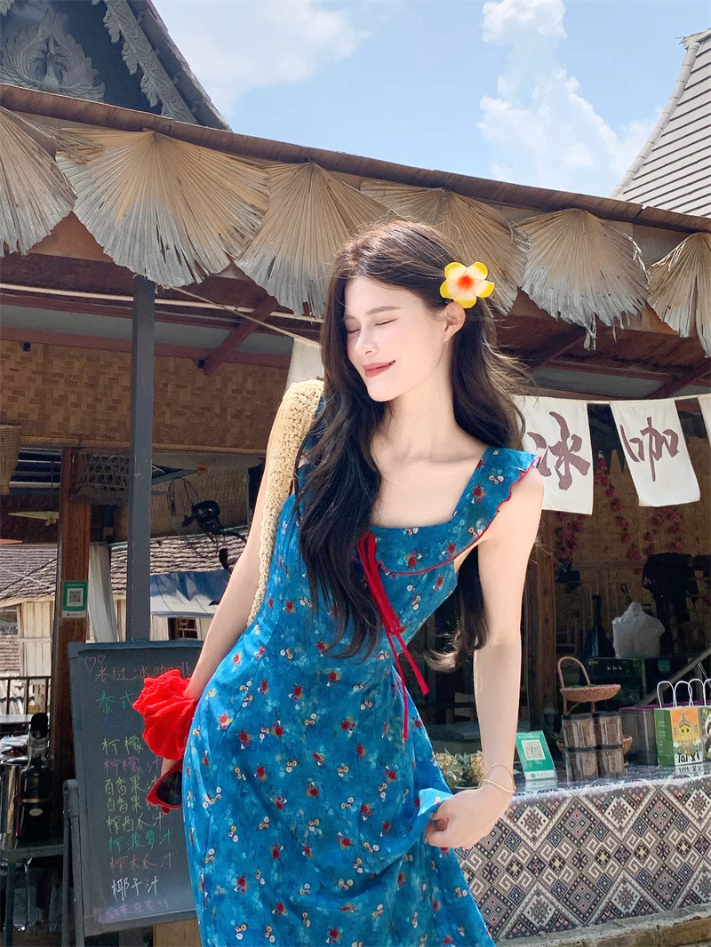 New Fashion Blue Floral Design A-line Square Collar Beach Holiday Sleeveless Dress HZ1024