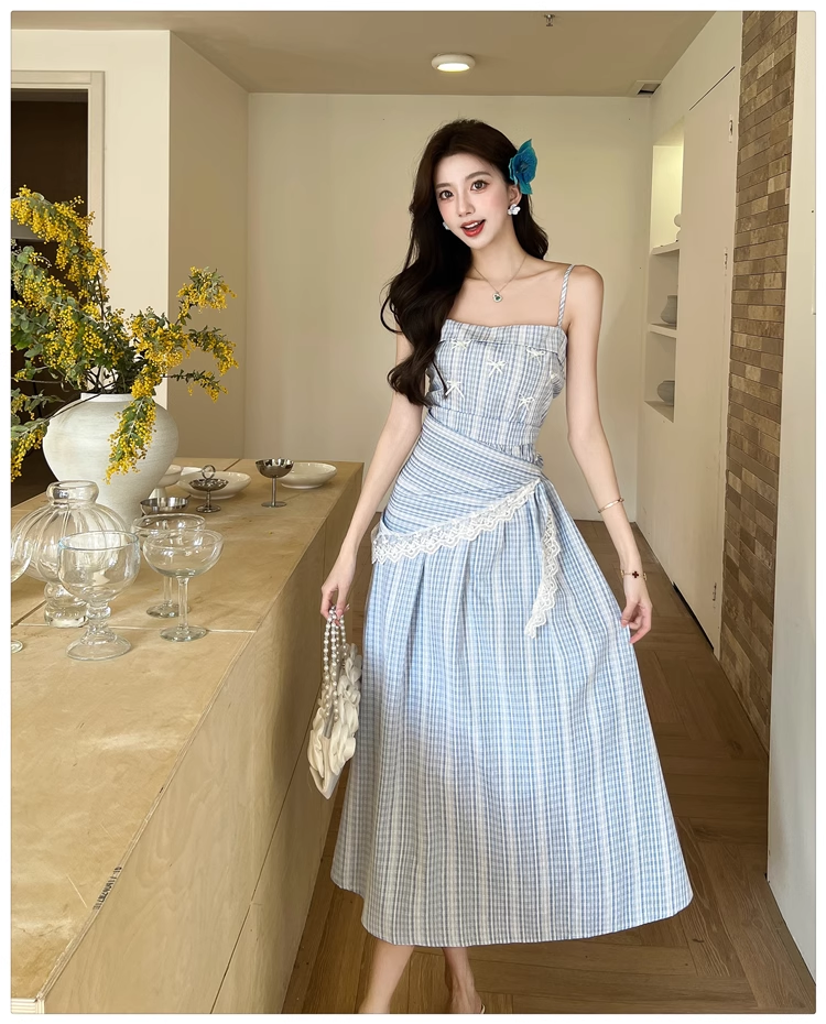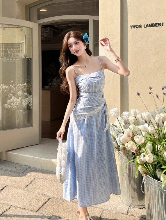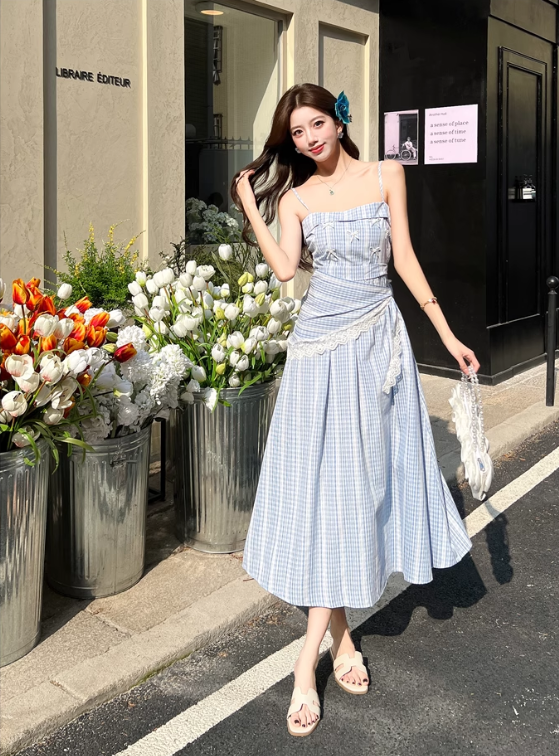 New Fashion Blue Stripe Design A-line Lace Spaghetti Strap Dress HZ1024