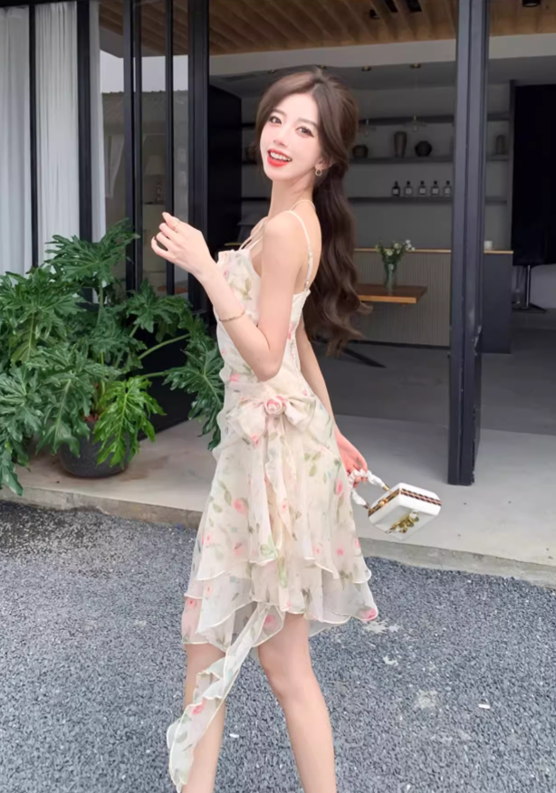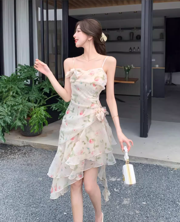 New Fashion Floral Irregular Ruffled Hem Design Elegant A-line Spaghetti Strap Dress HZ1024