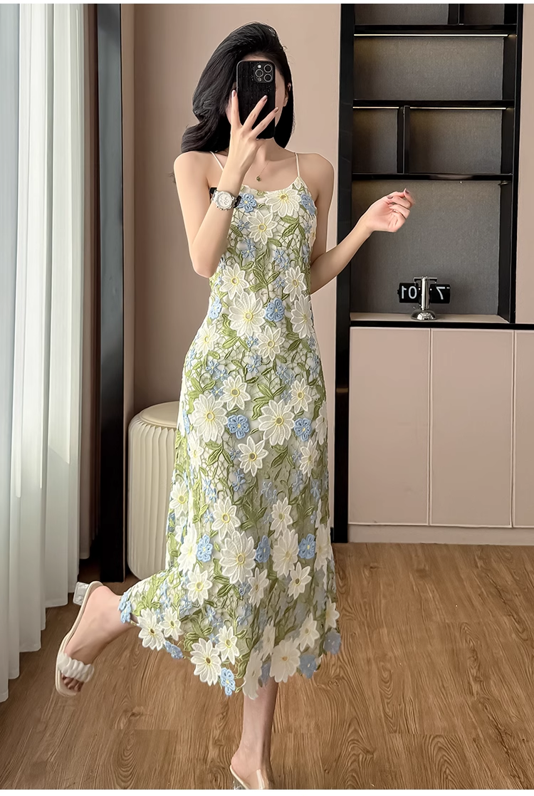 New Fashion Green Floral Embroidery Design Midi A-line Spaghetti Strap Dress HZ1024