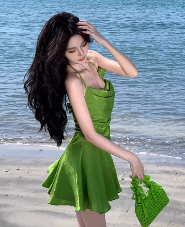 New Fashion Green Ruffled Hem Design A-line Beach Holiday Spaghetti Strap Dress HZ1024