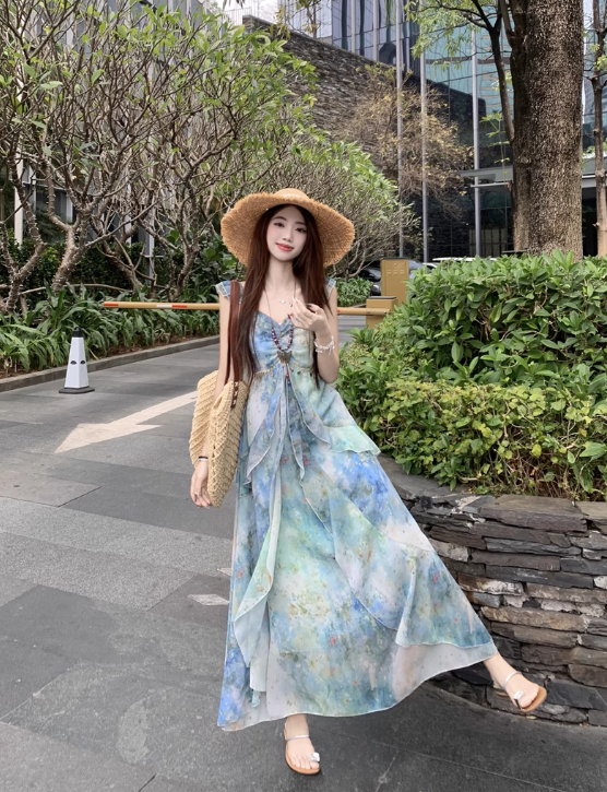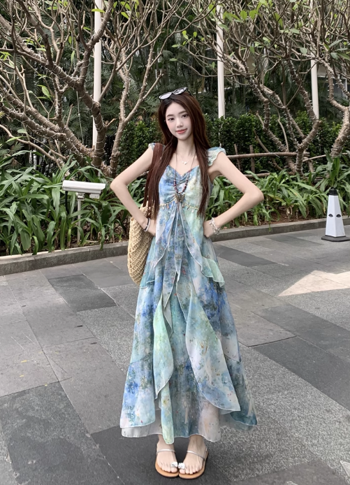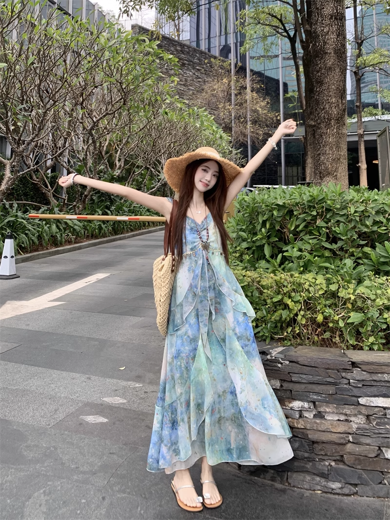 New Fashion Irregular Ruffled Dress Hem Design Beach Holiday A-line Sleeveless Floral Dress HZ1024