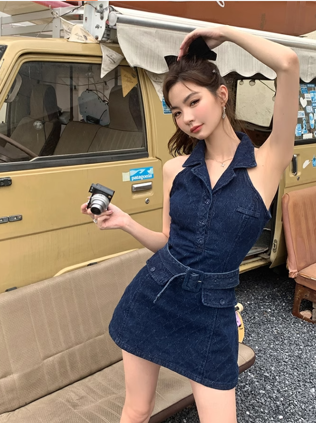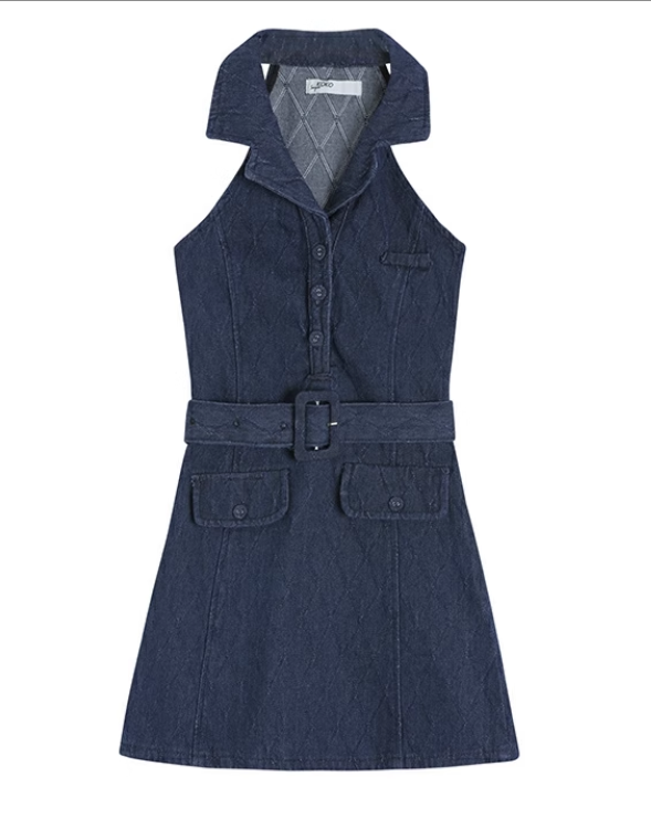 New Fashion Navy Blue V-neck Design A-line Sleeveless Denim Dress HZ1024