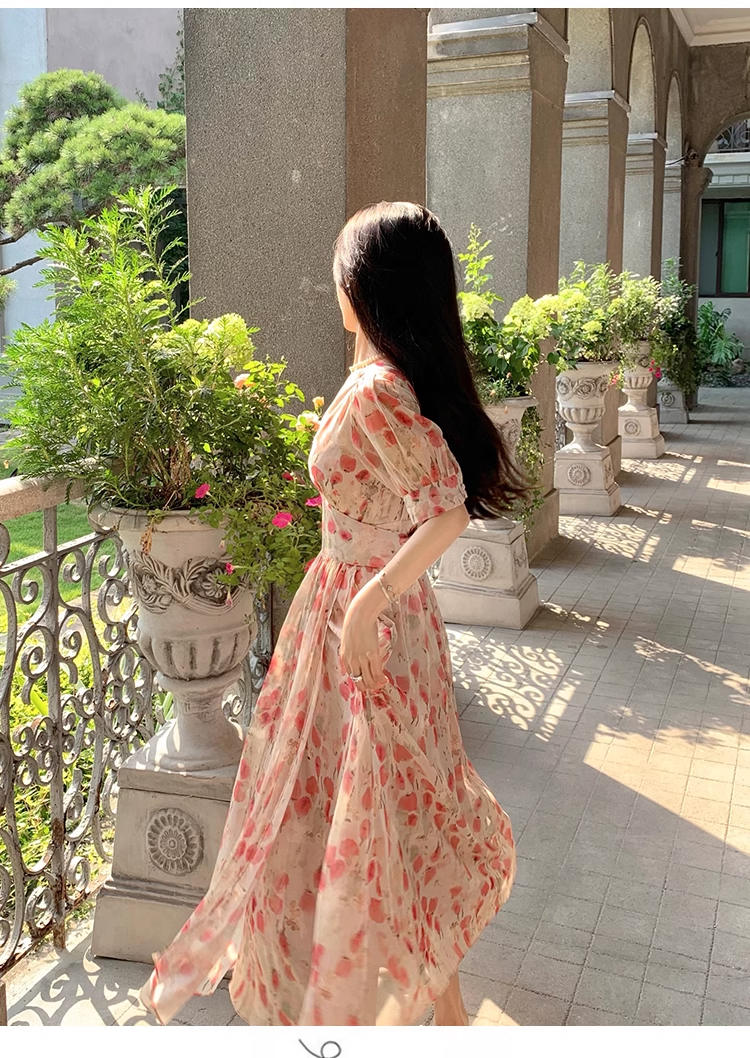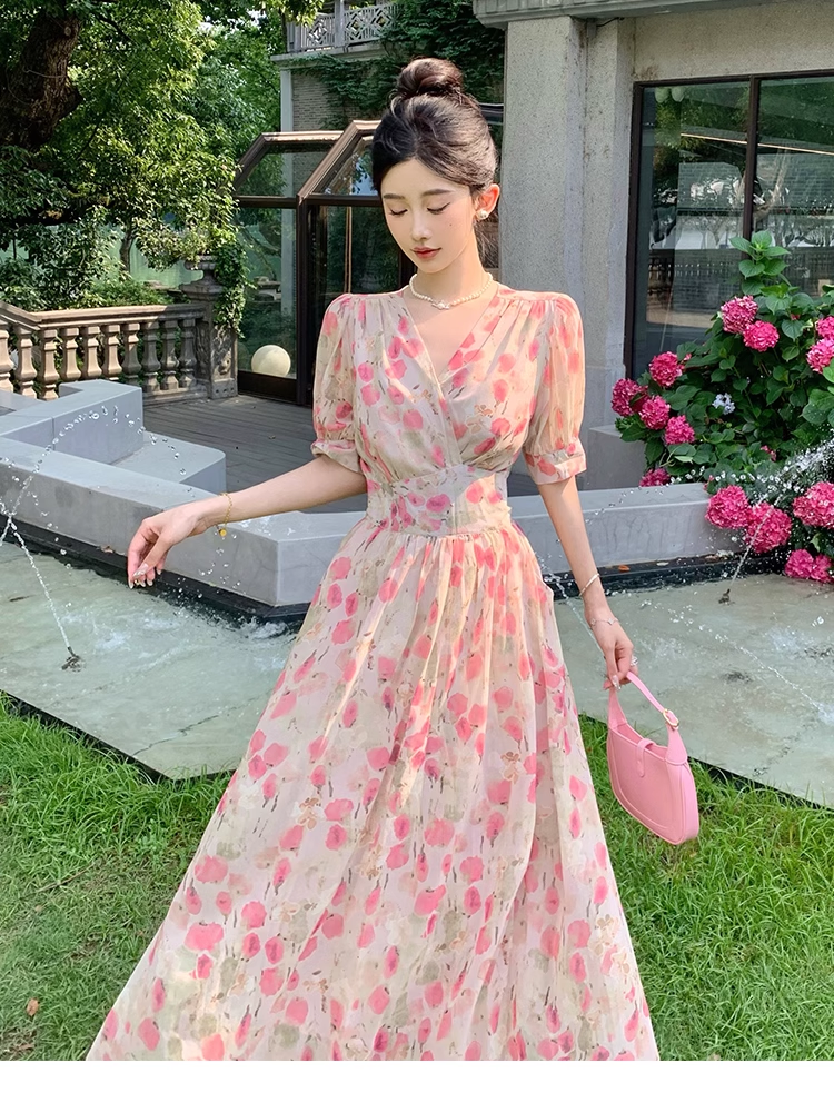 New Fashion Pink Floral Design Short Sleeves V-neck A-Line Women Long Dress HZ1024