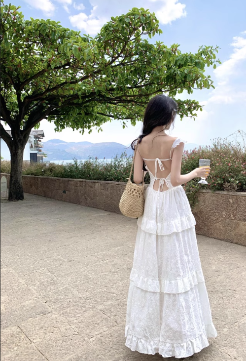 New Fashion White V-neck Tiered Dress Design Elegant A-line Spaghetti Strap Dress HZ1024