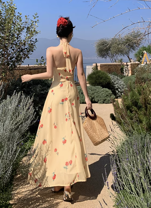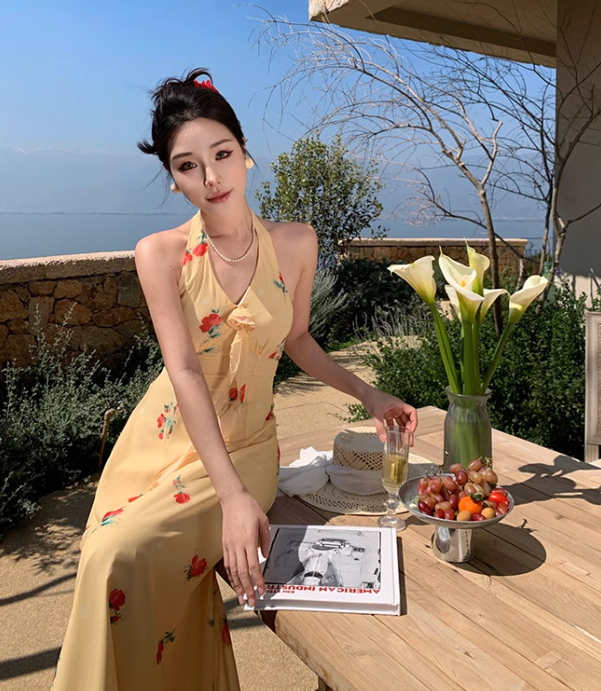 New Fashion Women Yellow Floral Design V-neck A-Line Chiffon Halter Dress HZ1024