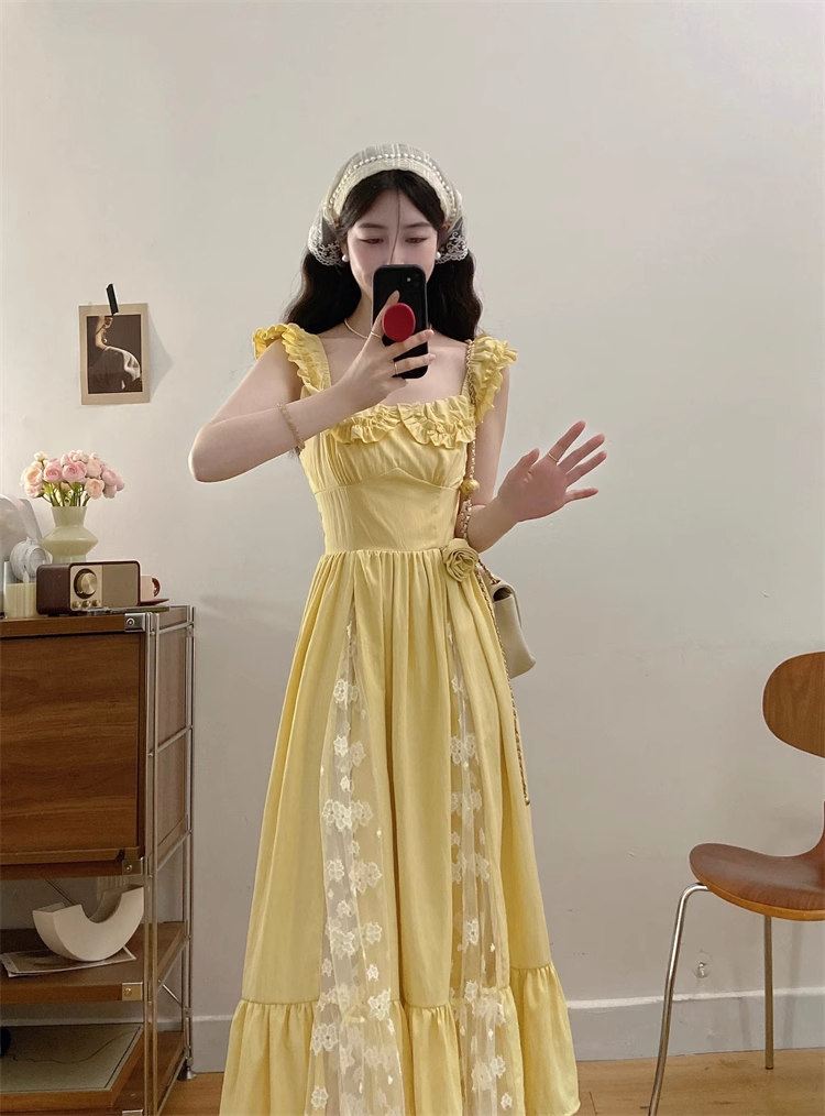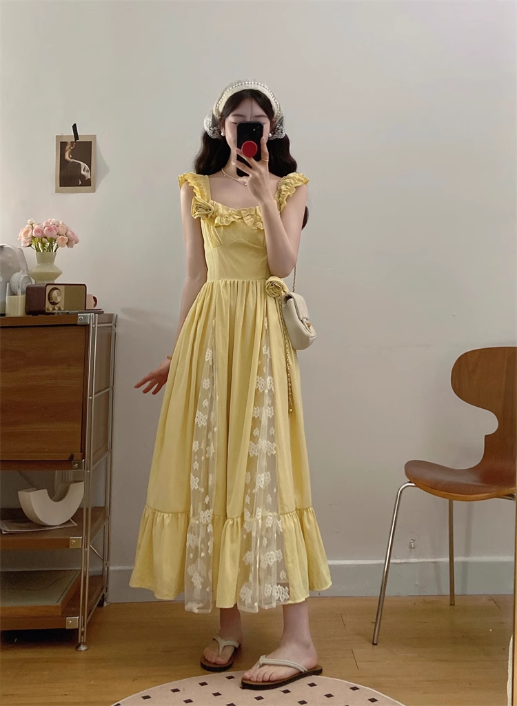 New Simple Fashion Yellow Floral Design A-Line Long Dress HZ1024