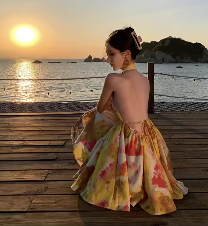New Stylish Yellow Floral Design A-Line Halter Dress HZ1024
