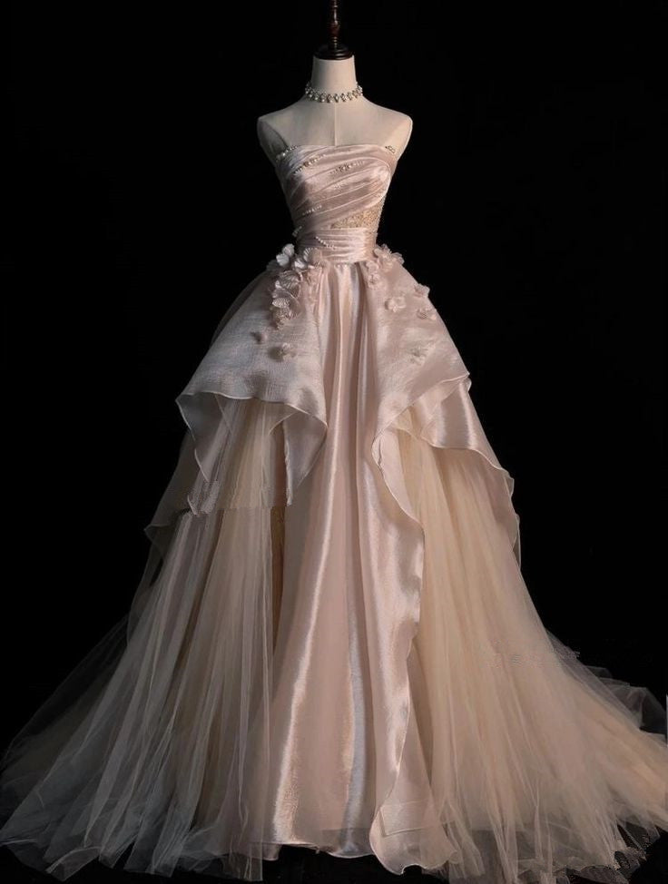 Pink Satin A-Line Strapless Tulle Long Evening Dresses HZ1024
