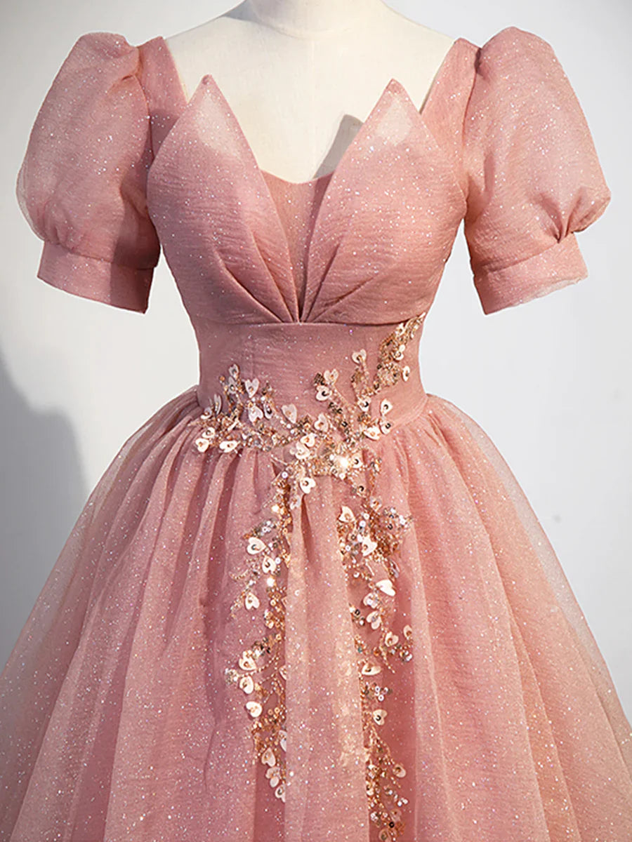 Pink Tulle Floor Length Prom Dress with Short Sleeve, Beautiful A-Line Evening Dress HZ1024