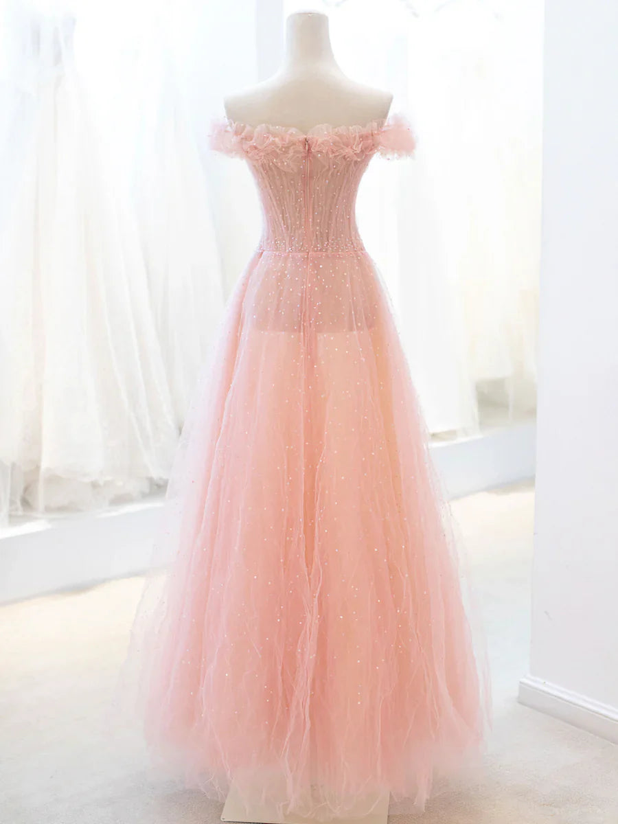 Pink Tulle Sequins Long Prom Dress, A-Line Lovely Evening Party Dress HZ1024