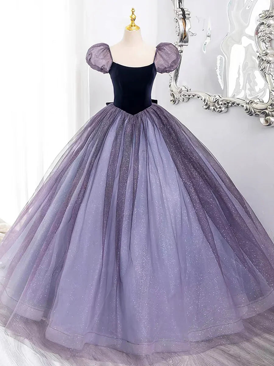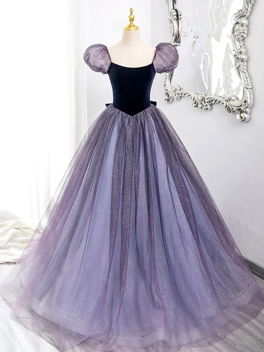 Purple Tulle and Velvet Floor Length Prom Dress, Beautiful A-Line Short Sleeve Party Dress HZ1024