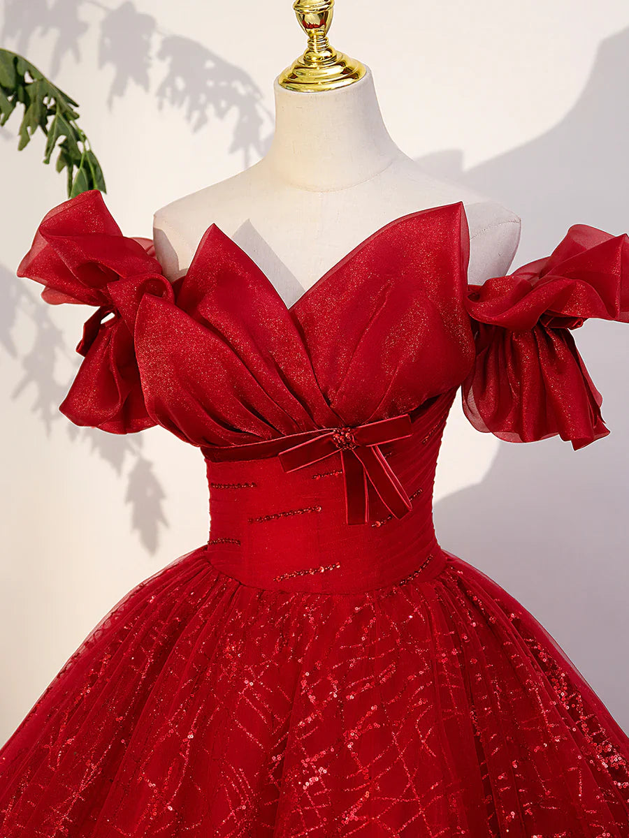 Red Tulle Long A-Line Ball Gown, Red Off Shoulder Formal Dress HZ1024