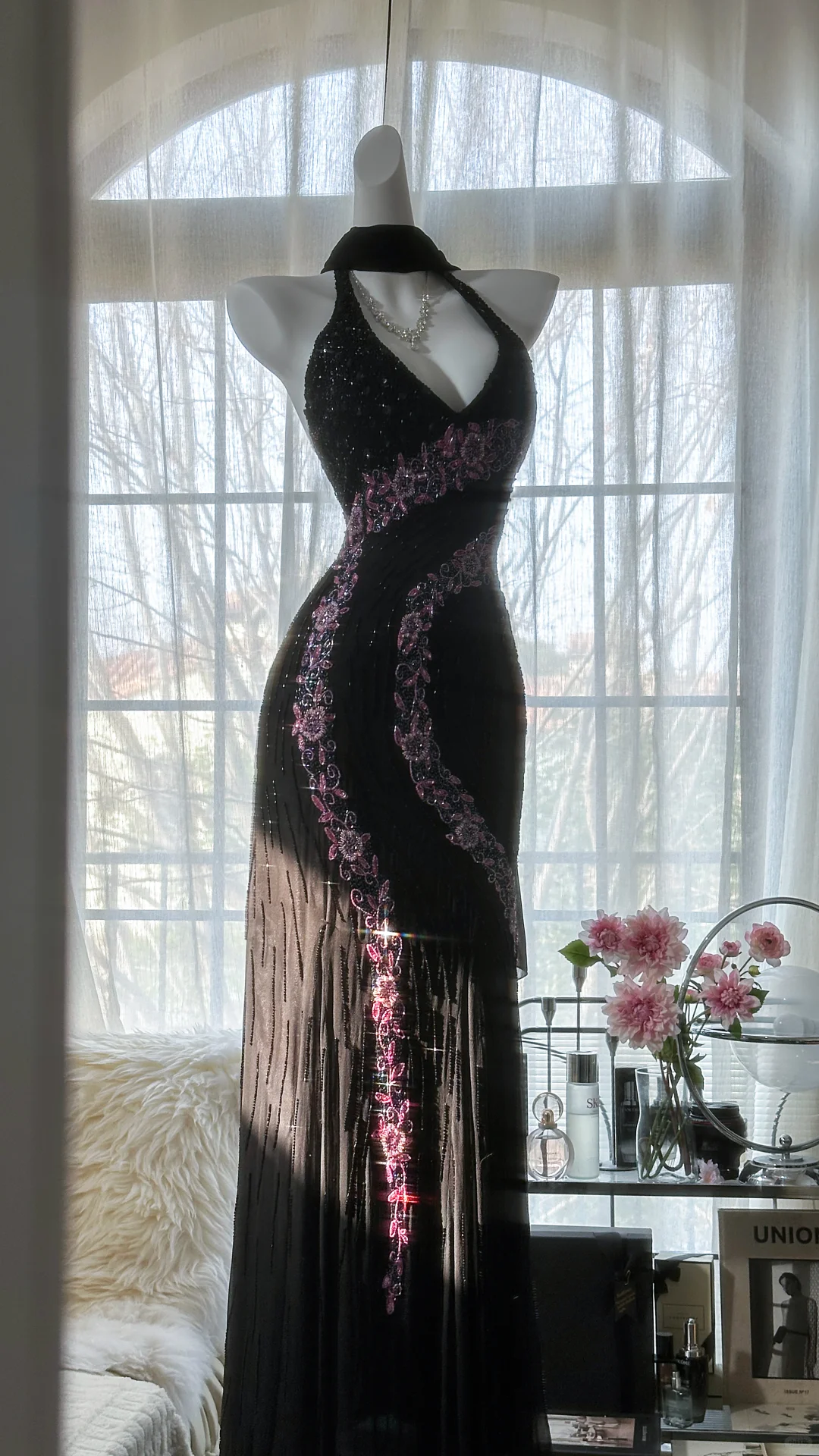 Retro Black V-neck Applique Design Romantic Chiffon Evening Dress Prom Dress HZ1024