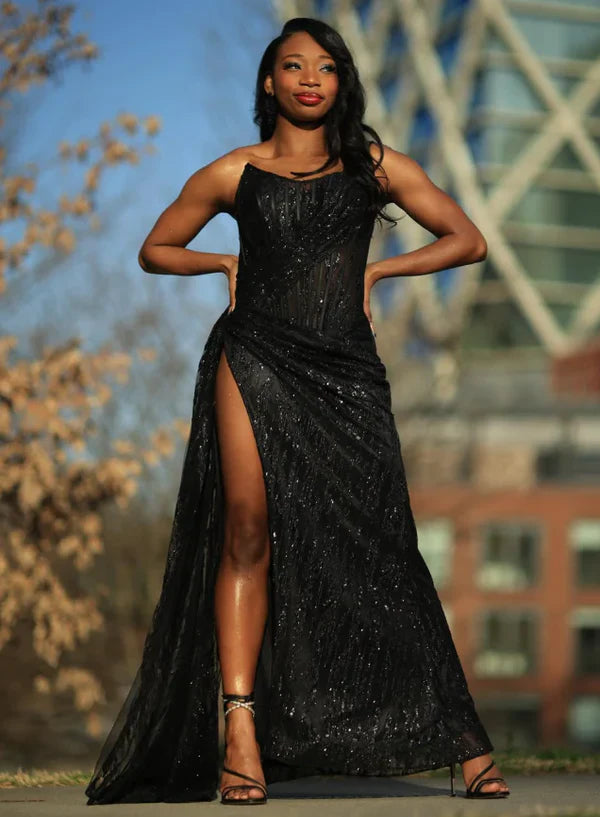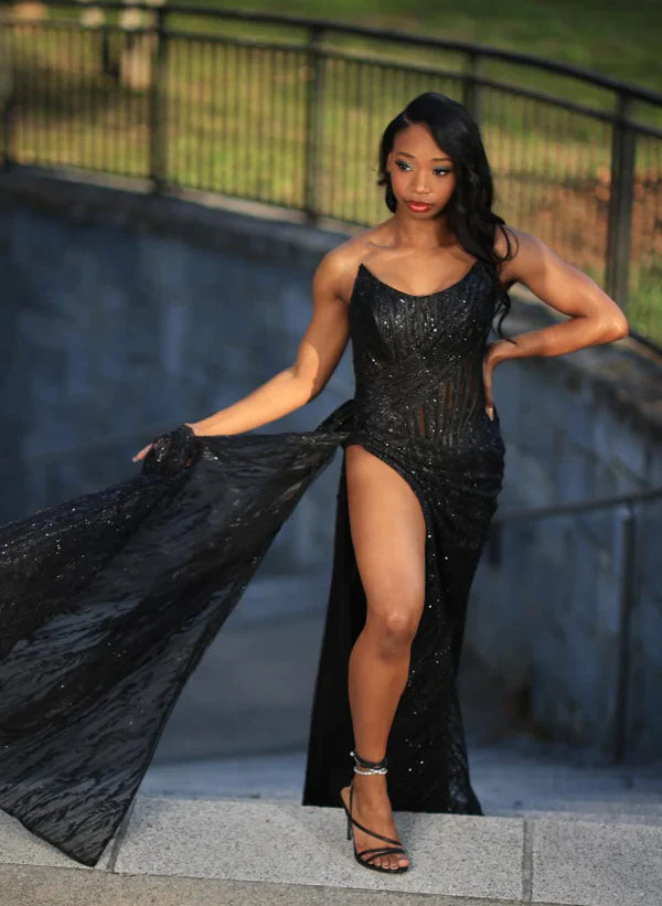 Sexy Black Mermaid Strapless Sequined High Split Long Floor Length Prom Dresses HZ1024