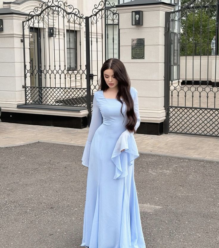 Simple Blue Square Neck Long Sleeve A-Line Formal Prom Dress Evening Gown HZ1024