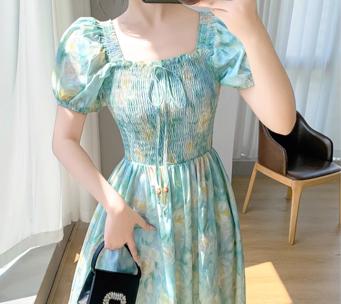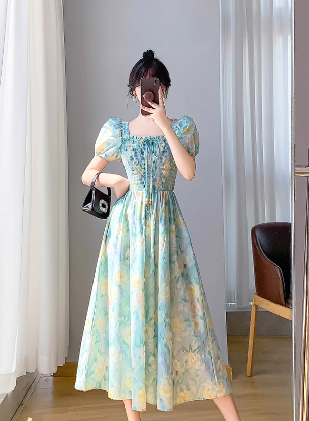 Simple Elegant Floral Design Short Sleeves Halter Dress HZ1024