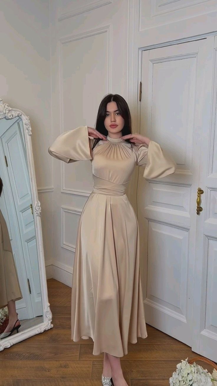 Soft satin champagne long-sleeved high-neck tea dress HZ1024