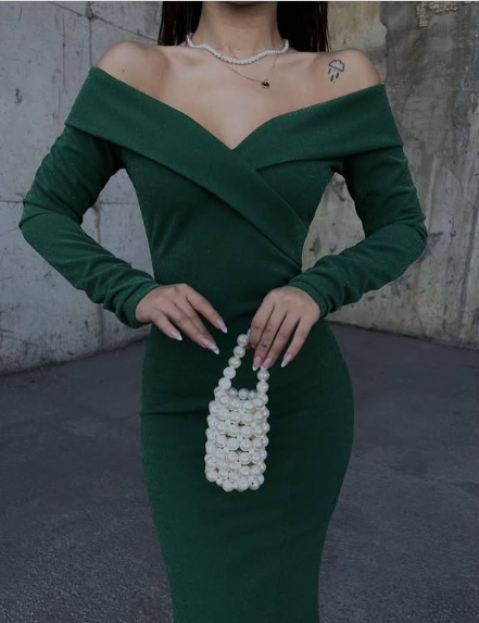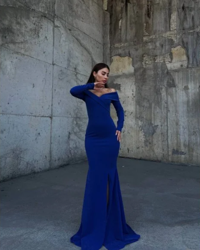 V Neck Off Shoulder Long Sleeve Mermaid Slit Glitter Formal Prom Dress Evening Gown HZ1024
