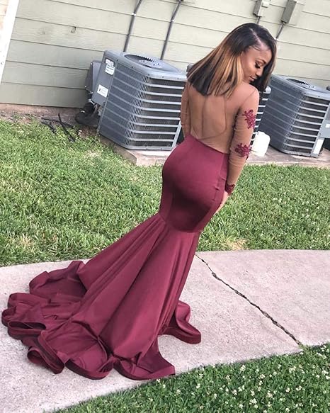 Vintage Burgundy Applique Mermaid Evening Gown Long-sleeved Backless Mermaid Prom Dresses HZ1024