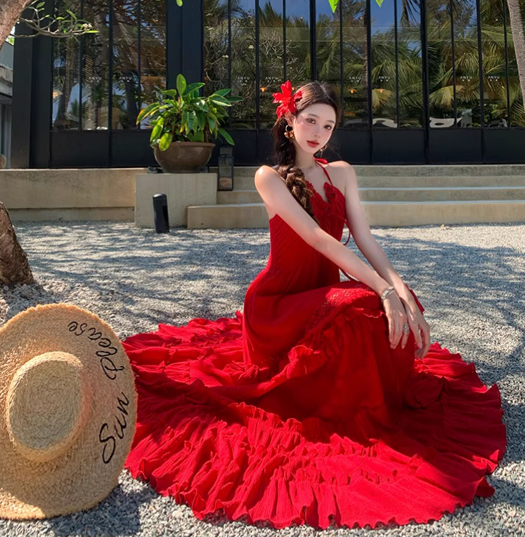 Vintage Burgundy V-neck Design Elegant Beach Holiday A-Line Sleeveless Halter Dress Summer Dress Party Dress HZ1024