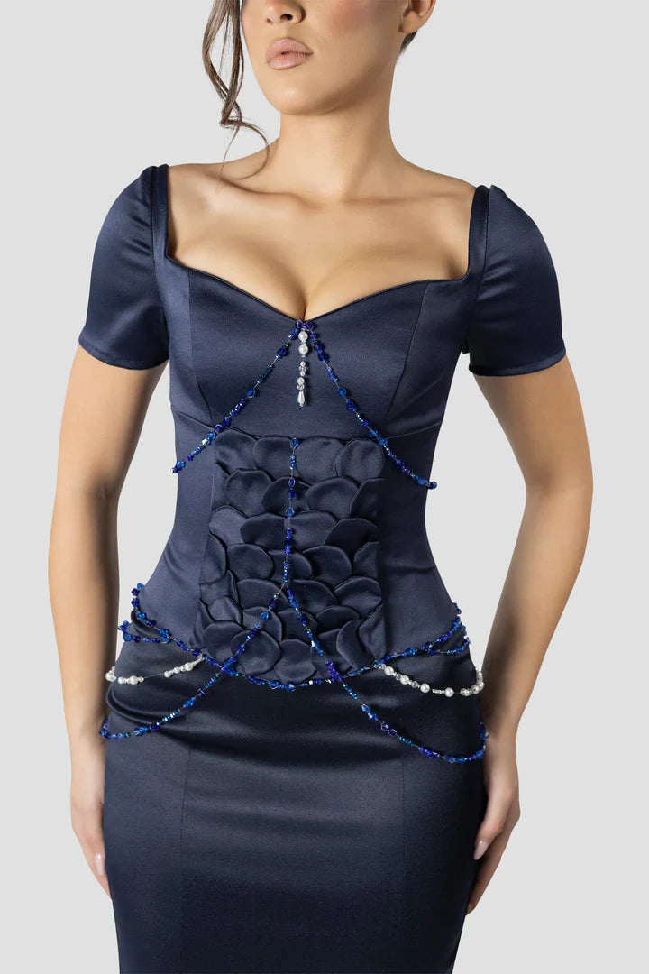 Vintage Dark Blue Mermaid Design Valentine Couture Satin Short-sleeved Prom Dress Evening Dress HZ1024