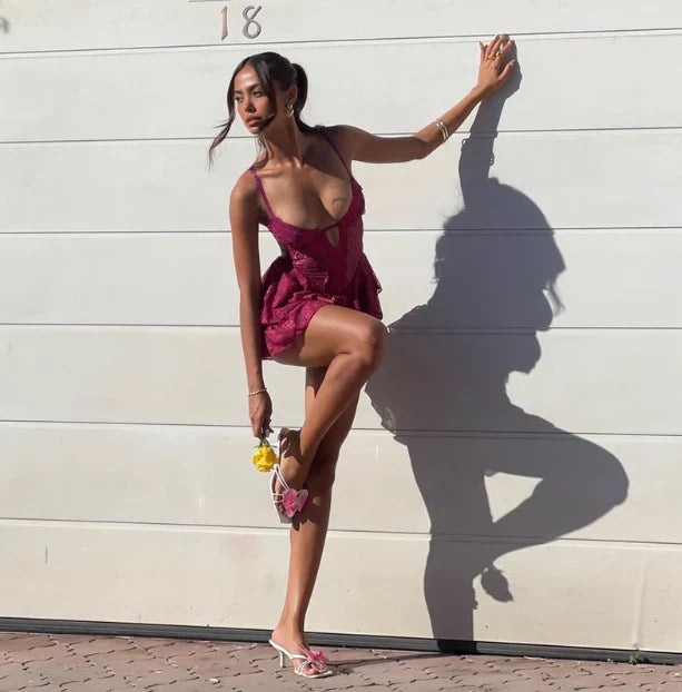 Vintage Fuchsia Lace Spaghetti Strap A-Line Short Tiered Party Dress Cocktail Dress Homecoming Dress HZ1024