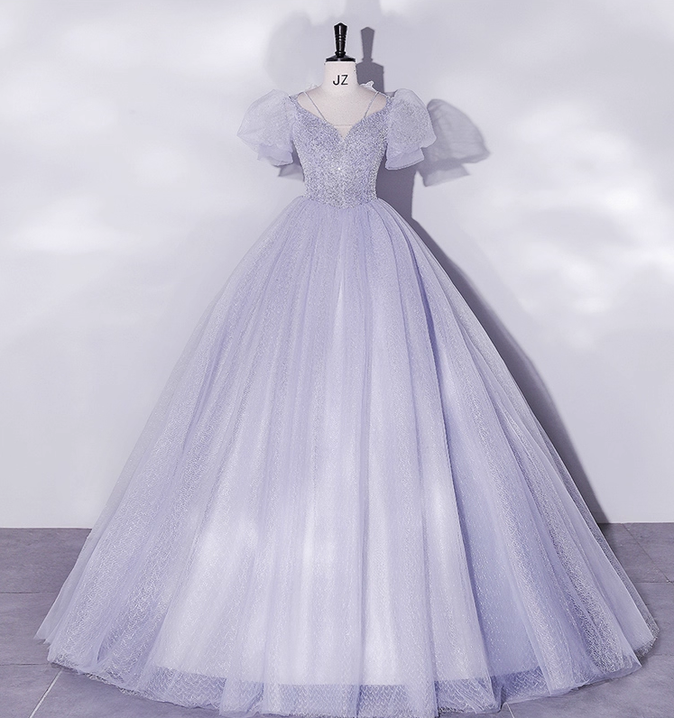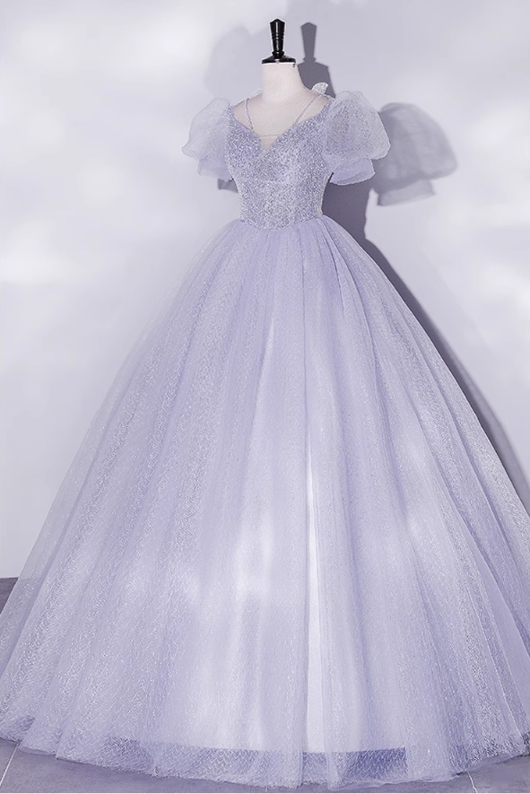 Vintage Hazy Blue Tulle Beaded A-Line Evening Gown Short-sleeved Party Dress Long Formal Dress HZ1024
