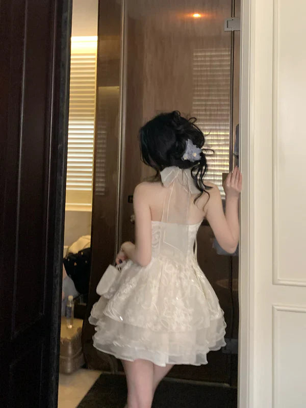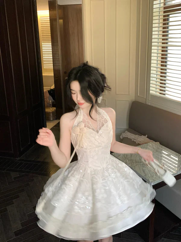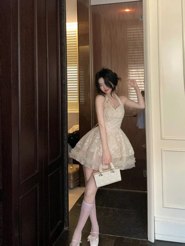 Vintage Ivory Lace A-Line Homecoming Dress Sequin Party Dress Short Halter-neck Cocktail Dress HZ1024