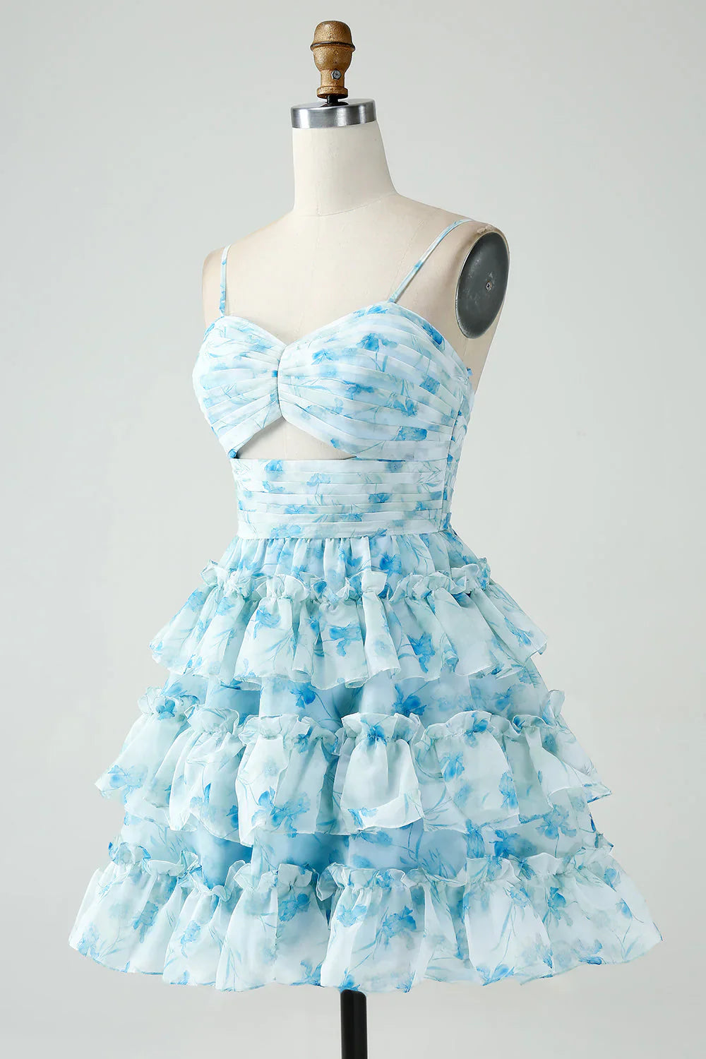 Vintage Light Blue Floral Design A-line Spaghetti Strap Tiered Homecoming Dress HZ1024