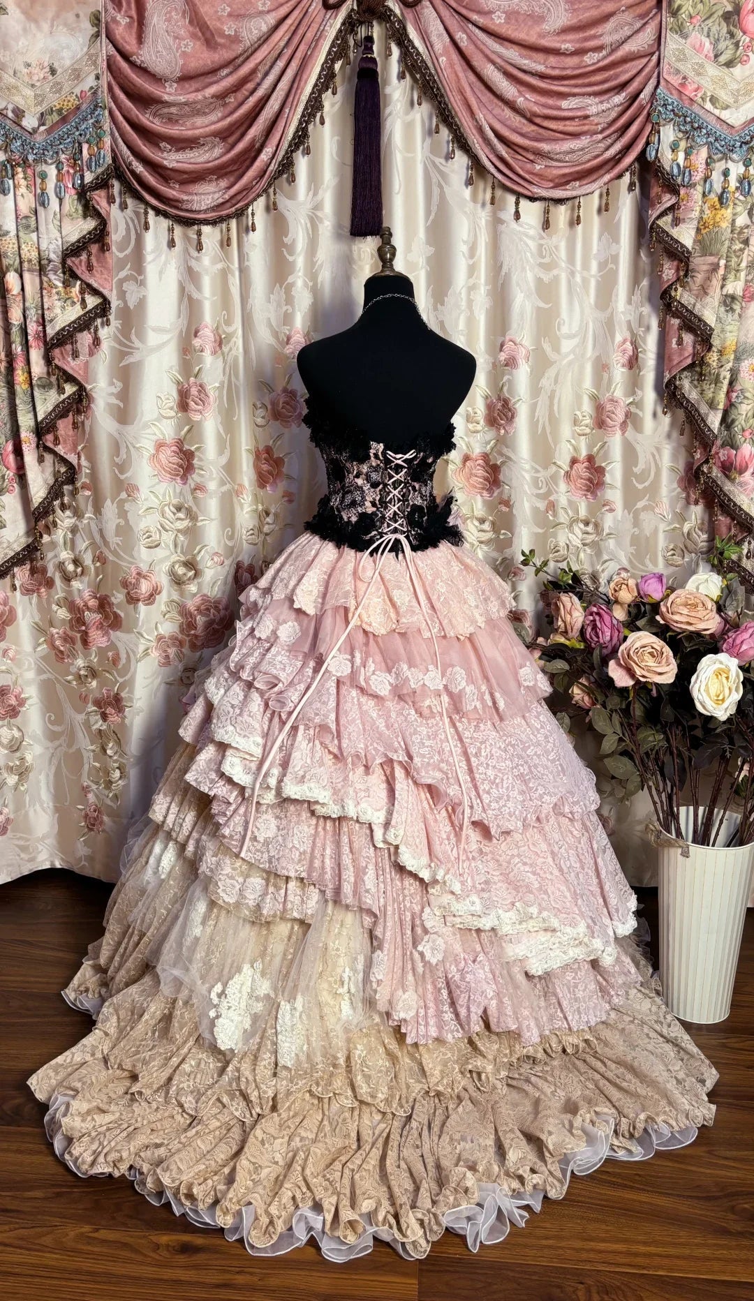 Vintage Pink Lace Strapless Tiered Sweet 16 Quinceanera A-Line Evening Dress Ball Gown HZ1024