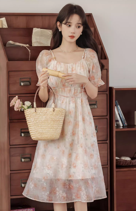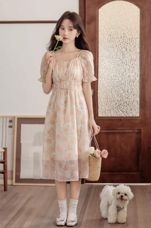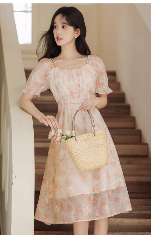 Vintage Women Floral Design A-Line Chiffon Short Sleeves Dress HZ1024