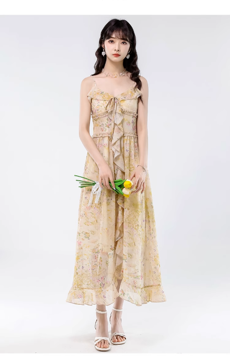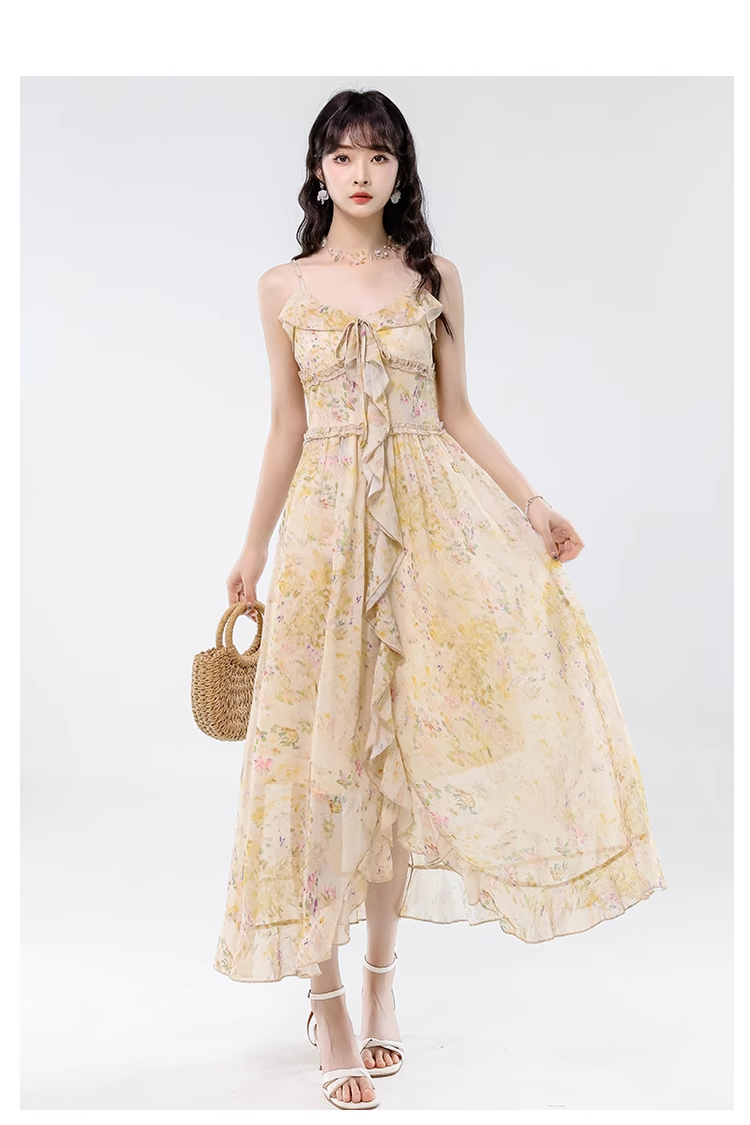 Vintage Yellow Ruffled Hem Floral Design Elegant A-line Spaghetti Strap Dress HZ1024